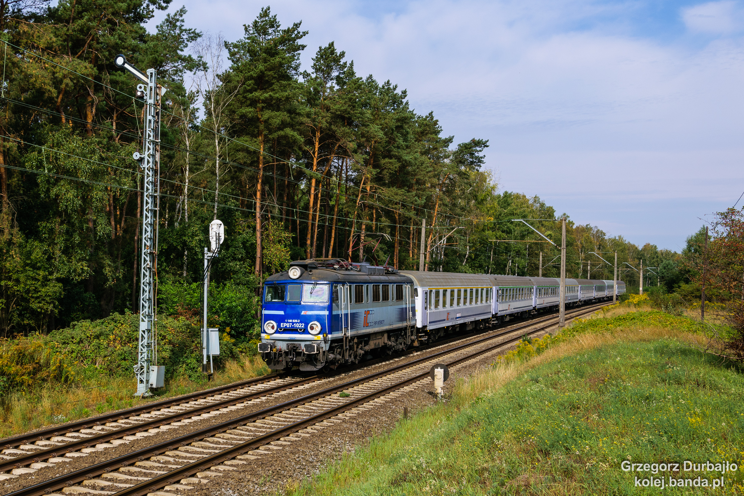 - Poznań Wola, EP07-1022 z pociągiem TLK Gombrowicz relacji Szczecin Główny-Lublin mija semafor wjazdowy.