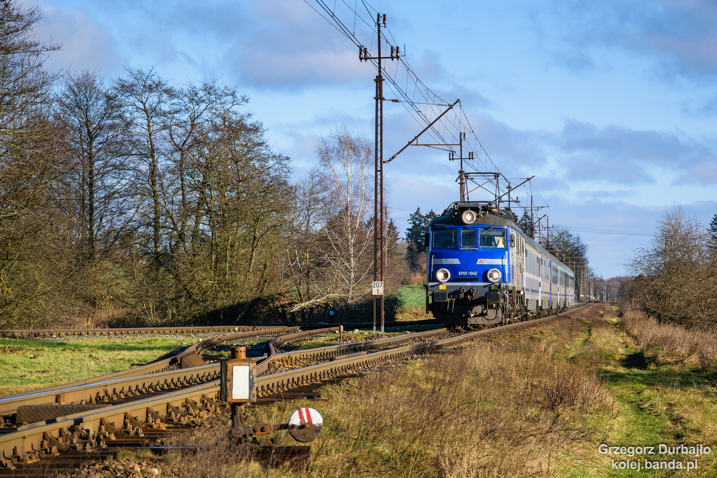 - Dunowo, EP07-1042 z pociągiem IC Szyndzielnia relacji Ustka-Bielsko Biała Główna udaje się do Białogardu.