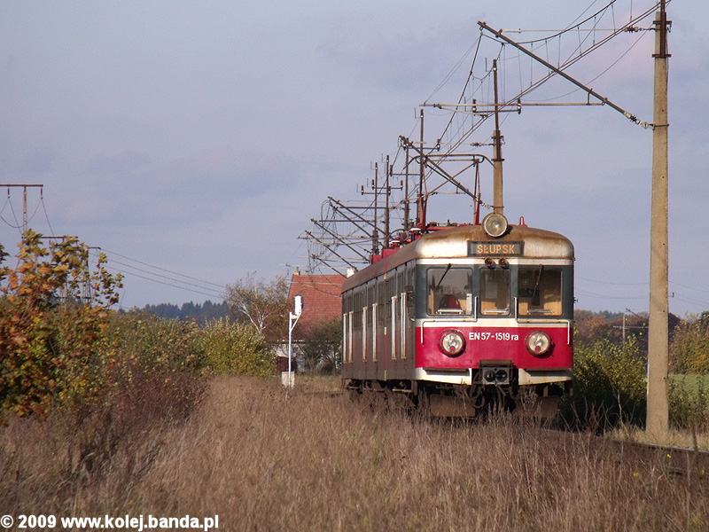 - Świdwin, EN57-1519 jako pociąg osobowy z Łobza do Słupska mknie w stronę Białogardu.