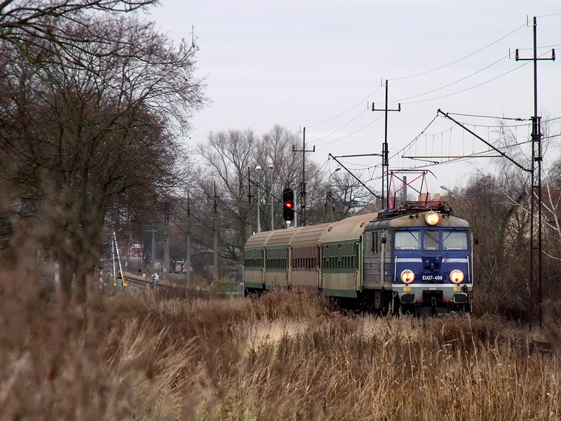 - Świdwin. EU07-488 z pociągiem pospiesznym "Bryza" z Olsztyna do Szczecina opuszcza miasto.