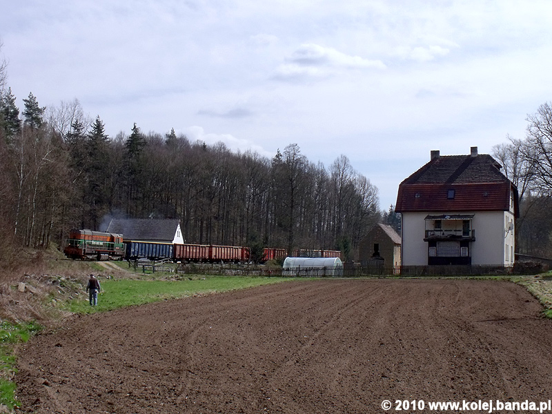 - Jerzmanice Zdrój. T448p-158 z pociągiem towarowym stacza się z Wilczej Góry, zbliżając się do stacji.