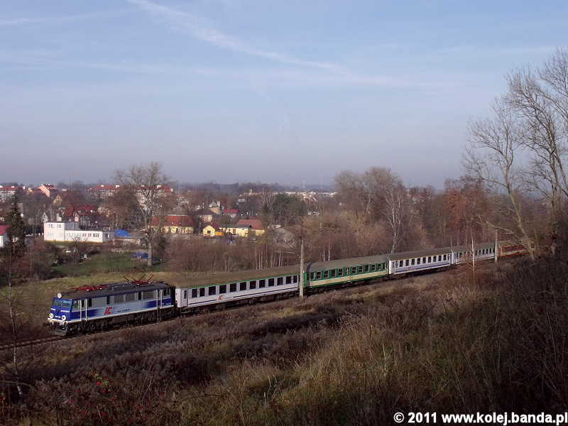 - Łobez. EU07-360 z pociągiem TLK z Olsztyna do Szczecina opuszcza miasto.
