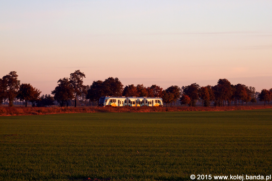 - Szlak Płoty-Nowogard, SA136 w promieniach wschodzącego słońca jako pociąg regio z Kołobrzegu do Szczecina po opuszczeniu p.o. Żabowo zbliża się do Nowogardu.