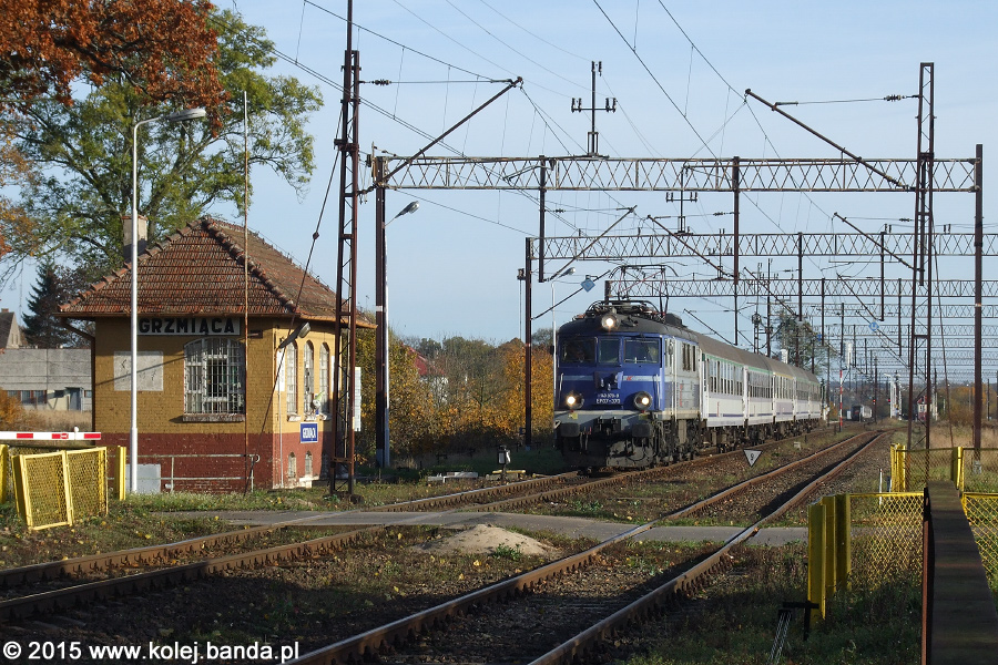 - Grzmiąca. EP07-370 z pociągiem TLK "Gwarek" z Katowic do Gdyni opuszczając stację za moment minie nastawnię wykonawczą.