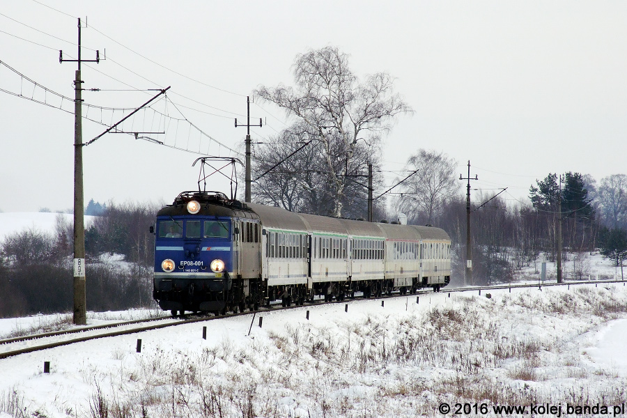 - Dalęcino, EP08-001 z pociągiem IC Gwarek relacji Katowice-Koszalin zbliża się do stacji, udając się do Białogardu.