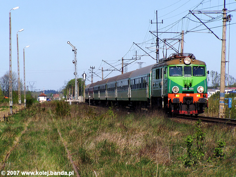 - Świdwin. EU07-423 z Bryzą jedzie w kierunku stacji.