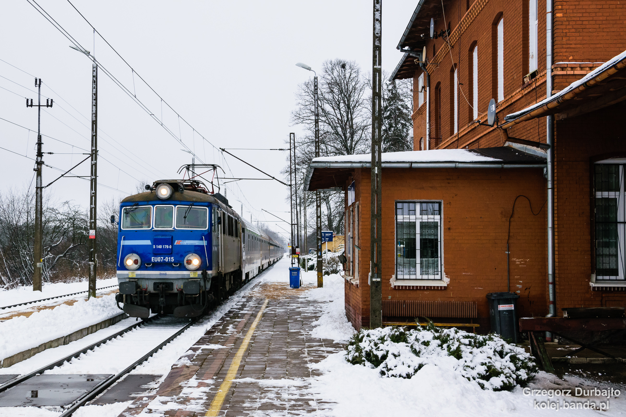 - Tychowo, EU07-015 z pociągiem IC Malczewski z Kołobrzegu i Słupska do Przemyśla mija na biegu stację.
