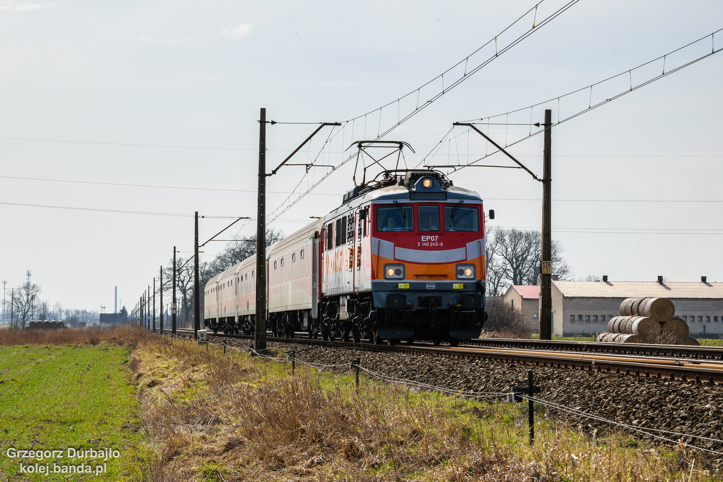 - Oborzyska Stare, EP07P-2001 z pociągiem regio relacji Wrocław Główny-Poznań Główny zbliża się do przystanku.