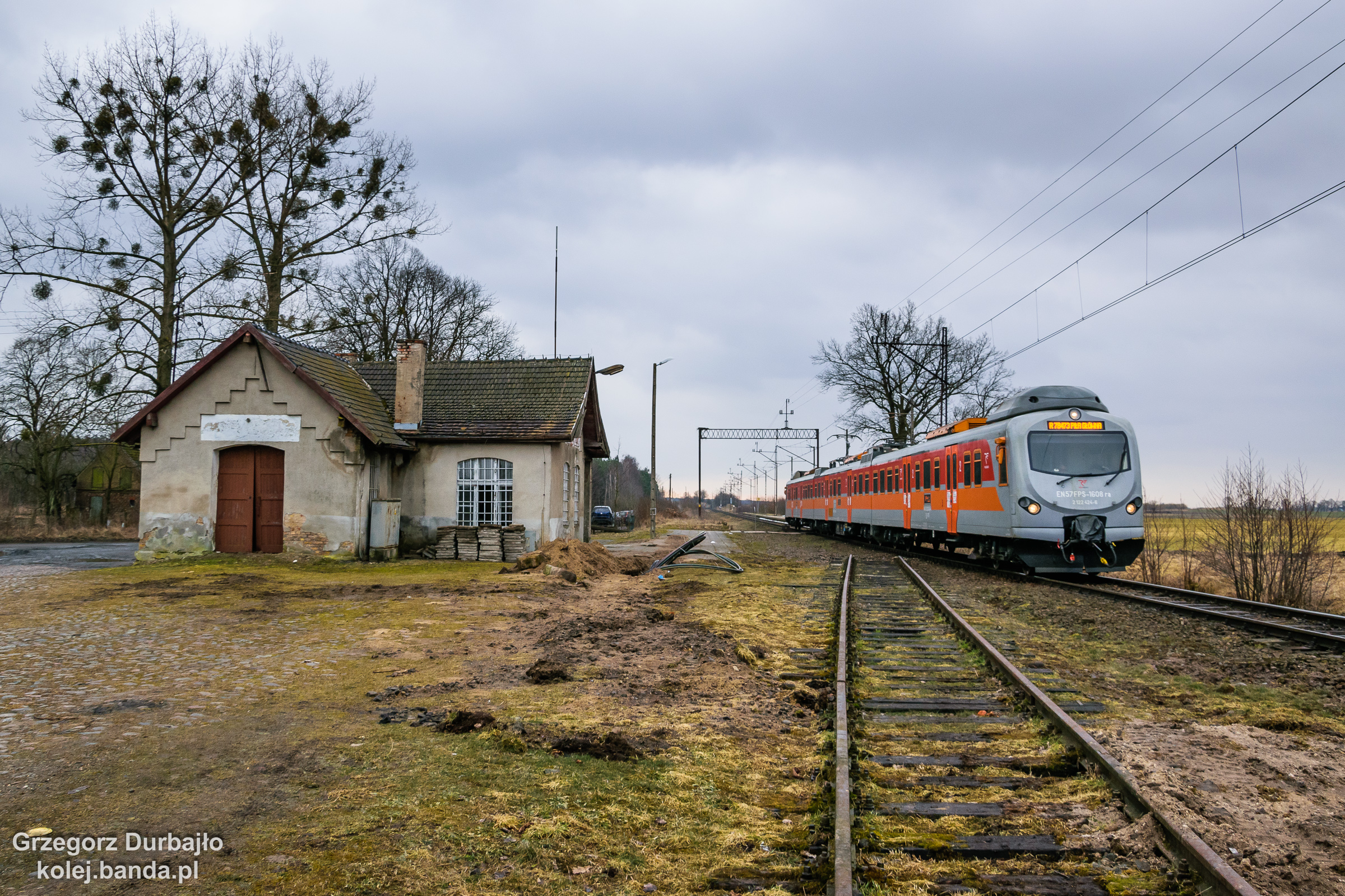 - Ostrówki koło Chodzieży, EN57FPS-1608 jako pociąg regio relacji Poznań Główny-Piła Główna opuszcza przystanek.
