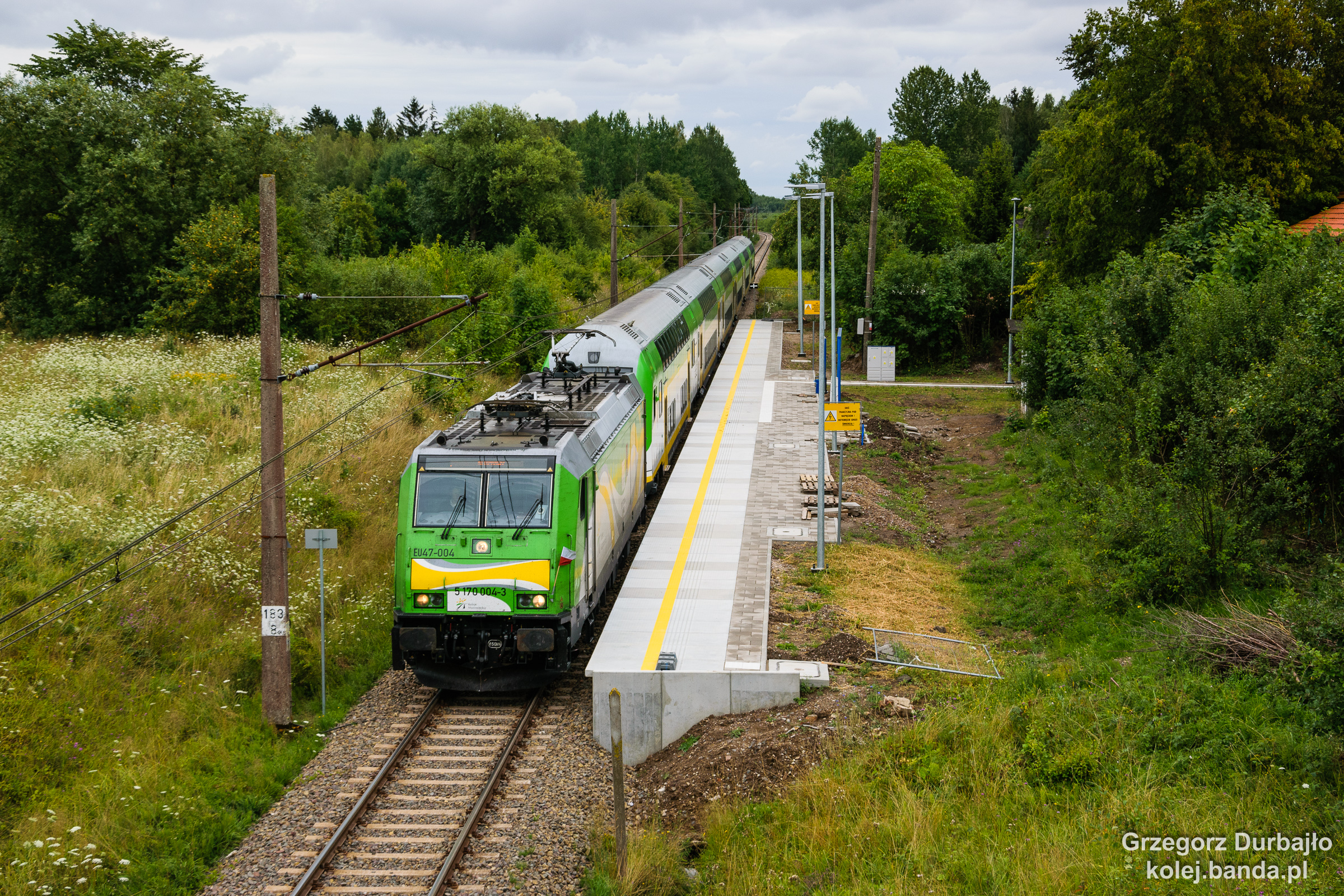 - Gałęzinowo, EU47-004 z wagonami Push&Pull jako próżny pociąg Kolei Mazowieckich relacji Słupsk-Ustka mija przystanek osobowy.