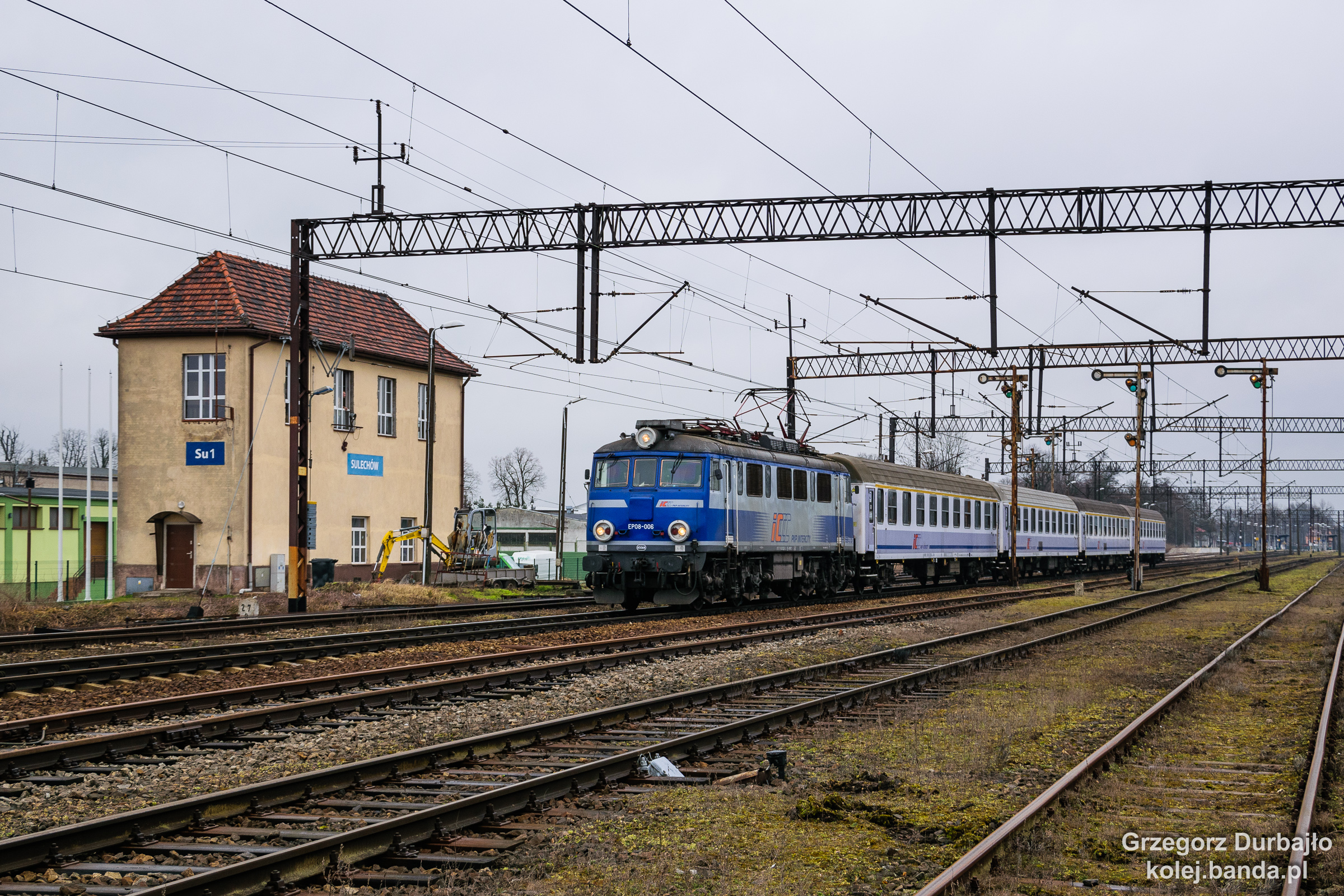- Sulechów, EP08-006 z pociągiem TLK Stoczniowiec relacji Gdynia Główna-Zielona Góra Główna opuszcza stację.