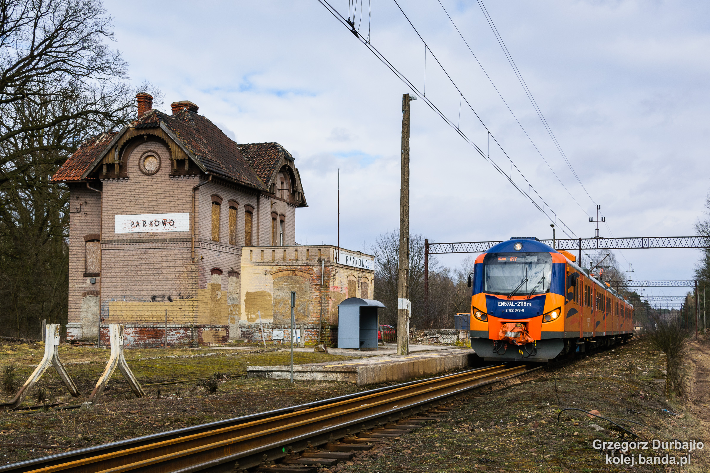 - Parkowo, EN57AL-2118 jako pociąg regio z Kołobrzegu do Poznania Głównego stoi na przystanku.