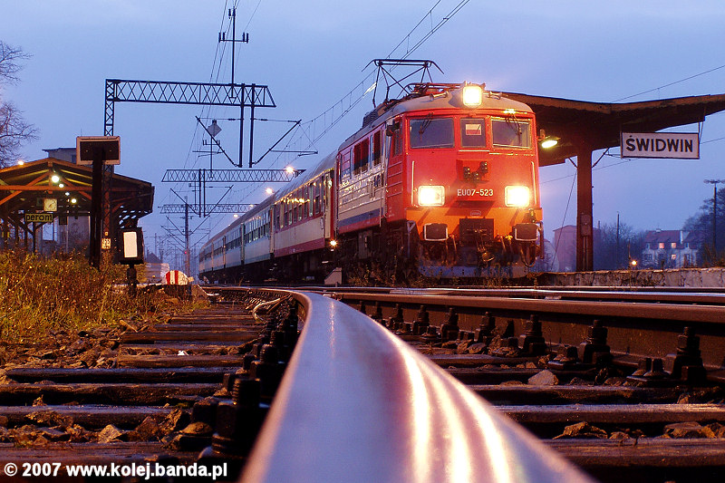 - Świdwin. EU07-523 z pociągiem pospiesznym "Gryf" czeka na odjazd.