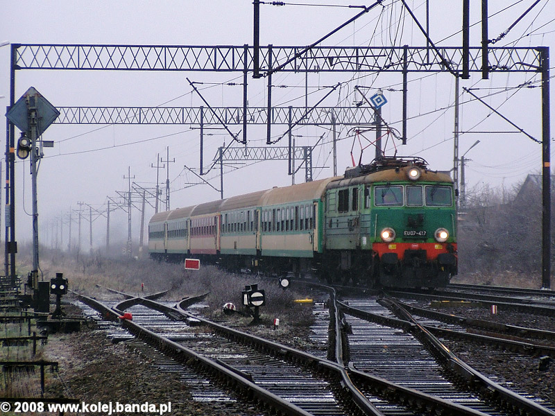 - Świdwin. EU07-417 z pociągiem pospiesznym "Bryza" z Olsztyna do Szczecina zbliża się do peronów stacji.