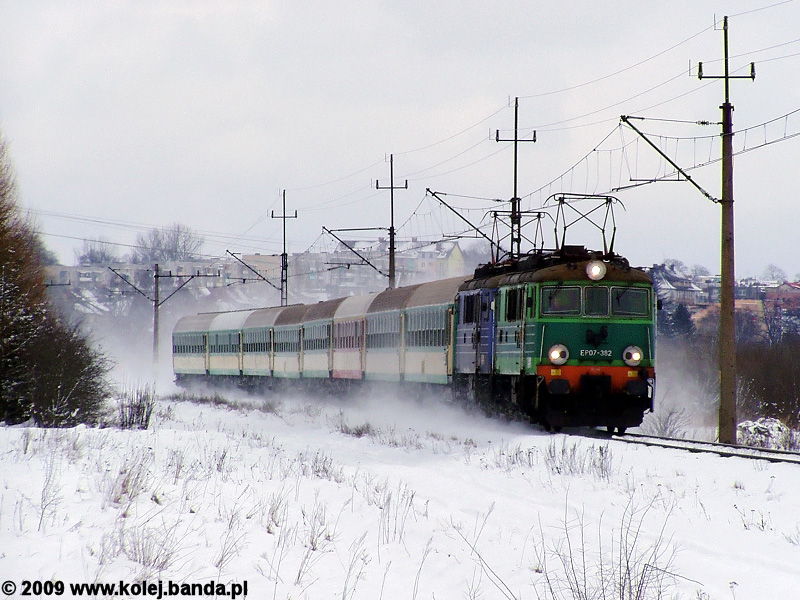 - Świdwin. EP07-382 wraz z EP07-389 z pociągiem pospiesznym "Bryza" z Olsztyna do Szczecina pomykają w kierunku Worowa.