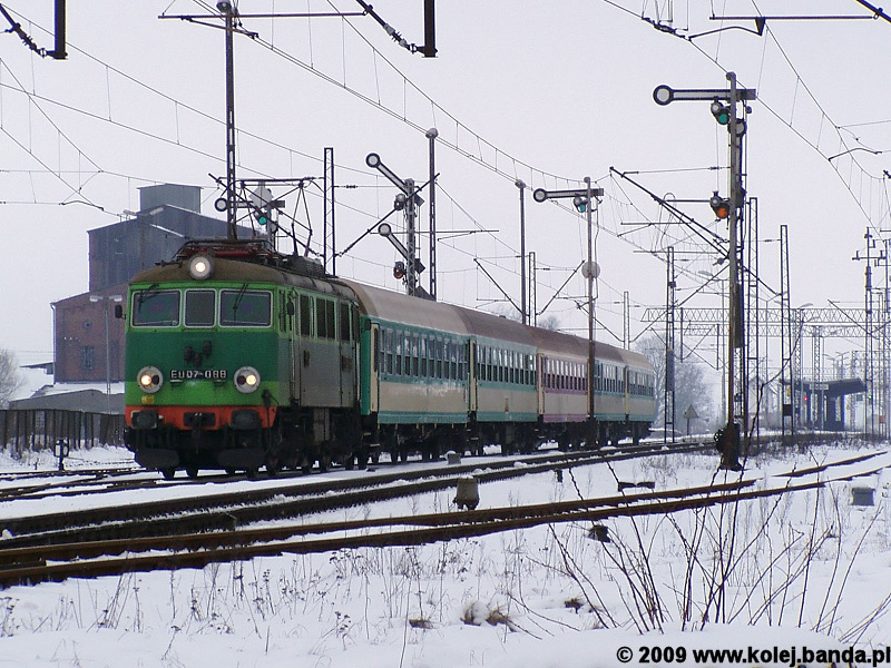 - Świdwin. EU07-088 z pociągiem pospiesznym "Albatros" z Tczewa do Szczecina wyjeżdża ze stacji.