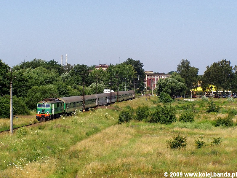 - Białogard. EP07-370 z pociągiem "Krakowianka" relacji Kołobrzeg-Kraków opuszcza miasto.