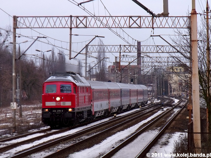 - Szczecin Główny. BR 234 278-0 z pociągiem EC do Pragi opuszcza miasto.