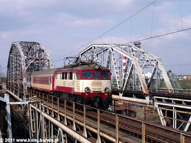 - Podg. Dziewoklicz, EP07-1029 z pociągiem TLK do Krakowa przemierza most nad Odrą Zachodnią.
