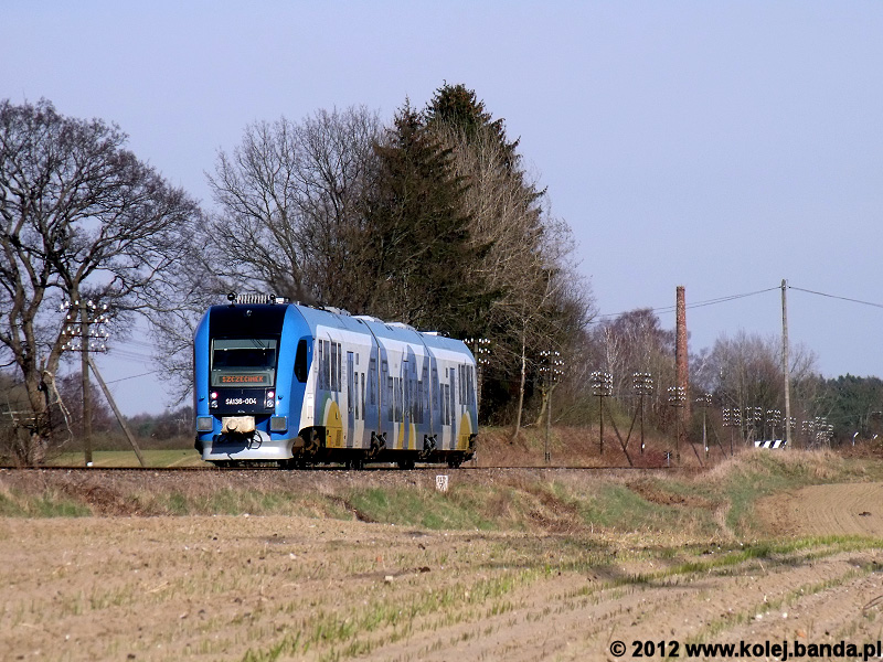 - Bobrowo Pomorskie, SA136-004 jako pociąg regio ze Szczecina do Szczecinka zbliża się do przystanku.