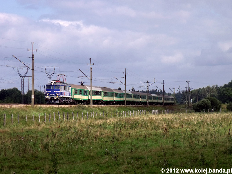 - Bystrzynka, EP07-1064 z pociągiem dodatkowym z kibicami Lechii relacji Gdańsk Główny-Szczecin Niebuszewo zbliża się do Świdwina.