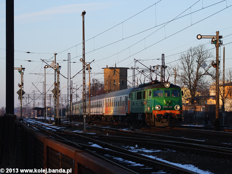 - Świdwin, EP07-442 z pociągiem TLK "Rybak" relacji Białystok-Szczecin opuszcza stację.